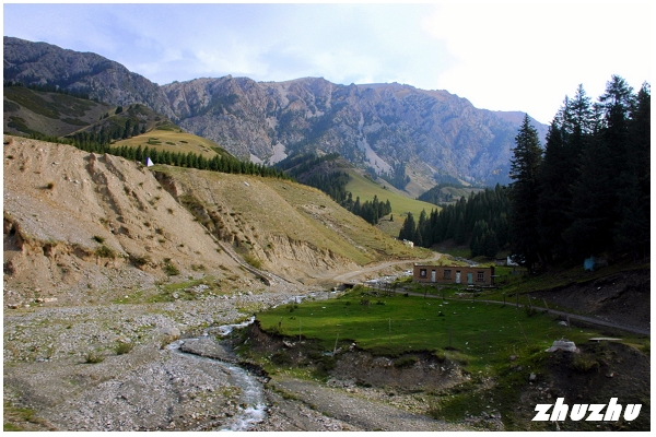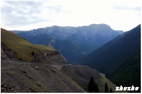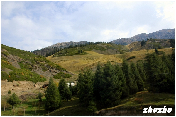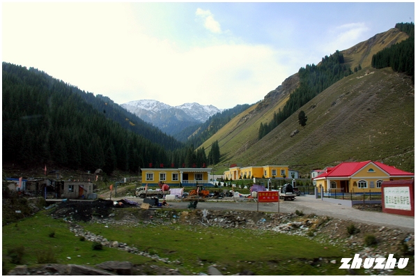 山谷多為松樹、草甸;此時天剛放晴,雪山、白雲、綠草、木房子,層次分明;公路繼續穿行在長滿茂密松林的山峰之間。沿途翻越山路十八盤,層林疊嶂,一步一景。果子溝以野果多而得名,可一路什麼都沒看到;路邊有很多賣蜂產品的,說明溝內必然果樹叢生、野花競放。查閱資料,果子溝整個溝谷河灘、山坡,長滿了野生的塞維氏蘋果和山杏、核桃;果子溝之名正是由此而來。元初耶律楚材在《西遊錄》中提到果子溝地皆林檎,樹陰蓊鬱,不露日色,林檎就是野蘋果。