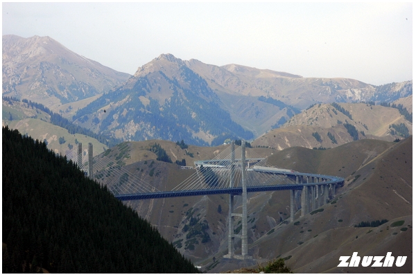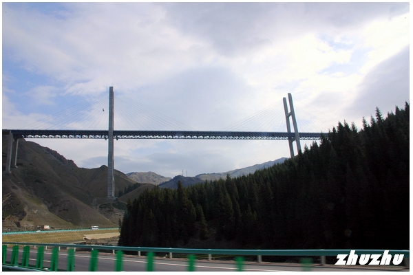 果子溝大橋是新疆首條山區高速公路大橋,也是新疆第一高橋,雙塔雙索面鋼桁樑斜拉橋,全長700公尺