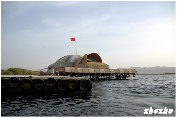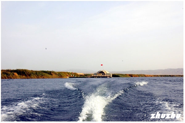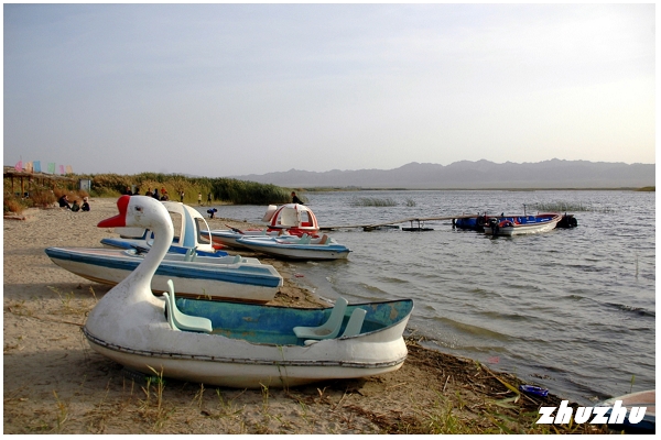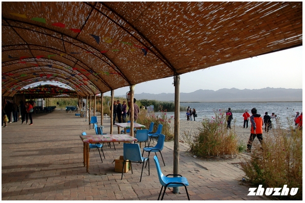 快艇載遊客到達的灘岸,也不知叫什麼名字;好像是伸入湖中的一個半島,有大片的沙灘,許多遊人在湖邊脫了鞋,在淺水中玩水。此處水清透澈,低頭可見許多小魚在水裏游來遊去。沙岸旁邊還是大片的蘆葦蕩,很多白鷺站立在水邊,長嘴一啄一啄的覓食。一個用竹子搭就的大棚,成為遊人休憩之處;湖邊還有很多賣燒烤的攤點,內容主要是烤小蝦、博湖特產的小赤鱸(這魚長不大的)、烤大頭魚、烤鯽魚。點的人很多,可以看得出大陸現在富裕後,消費力驚人。