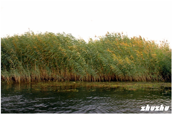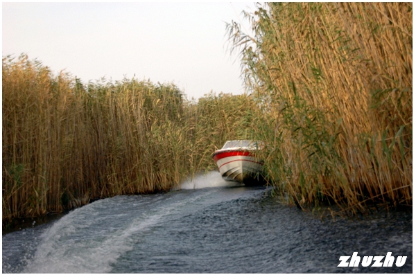 觀賞了花團錦簇的湖濱風光之後,已到快艇收班的時間,匆忙間重新再登快艇,駛回小湖邊的葦蕩,又是一番美景-就像闖進了綠色王國,放眼望去,密密麻麻的蘆葦,好似雨後春筍,萬笏朝天地從湖中伸出頭來,一直鋪向水天相連的遠方。萬頃碧波,浩浩蕩蕩,千重浪花,銀光閃耀;葦蕩深處有一群一群的野鴨、鴛鴦、天鵝等水鳥,在船前船後,追愛戲遊,展翅飛翔,構成一幅奇妙的畫卷。