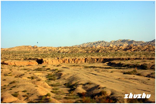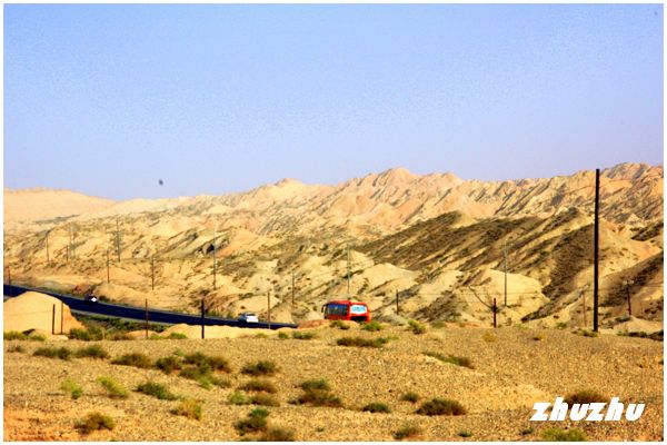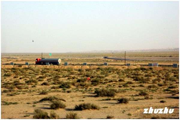 離開察爾齊雅丹地貌後,仍是一路的沙漠與綠洲相間,樹多白楊,果樹則梨、核桃,農作則有玉米、棉花。越野車沿G307公路繼續西北走,眼前更加遼闊起來。無邊無際的戈壁沙漠,正如浩瀚的海洋,雖然海洋變化萬千,時時給人以驚險的感受;但貌似溫柔、寧靜的沙漠,其蒼茫也足以吞噬任何生命。如果說沒有公路,行走在塔克拉瑪干大沙漠,很快就會失去方向,在無以依靠的處境中絕望。
