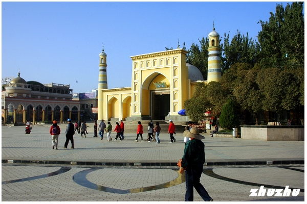 清真寺前的廣場,就是艾提尕廣場,很大。凡去做禮拜的,都會在廣場停留;做完禮拜後,一家人來到廣場拍照留影。艾提尕廣場,平日是喀什人民散步、交易、遊覽的場所。每逢盛大的節日(主要是古爾邦節與肉孜節),寺門頂部的平臺上就會響起激越亢揚、響徹雲霄遏行雲的納格拉鼓聲和哨呐秦樂聲;此時,維吾爾族群眾雲集艾提尕廣場,跳起了奔放熱烈的薩瑪舞,以狂熱的舞蹈送舊迎新。