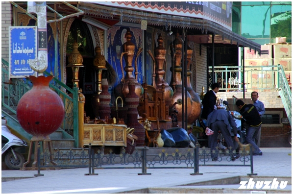 喀什號稱是歐亞大陸國際之城,城市建設自然日新月異;很難讓人相信早些年,喀什是牛羊滿街、塵土飛揚。走在庫木代兒瓦札路上,敲擊金屬的聲音、砂輪的沙沙聲、加工木製品的混合聲,隱約還有彈撥的琴聲,好生熱鬧。巷子裡走出來的維族婦女給人以神秘的感覺,維族姑娘的輪廓都令人神魂顛倒;不時有自彈自唱的男人個個英俊,但歌聲卻感覺那麼憂鬱,還有整理串烤羊肉鐵圈的小販。.