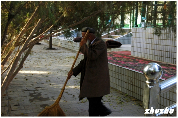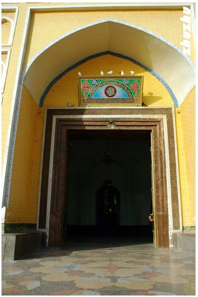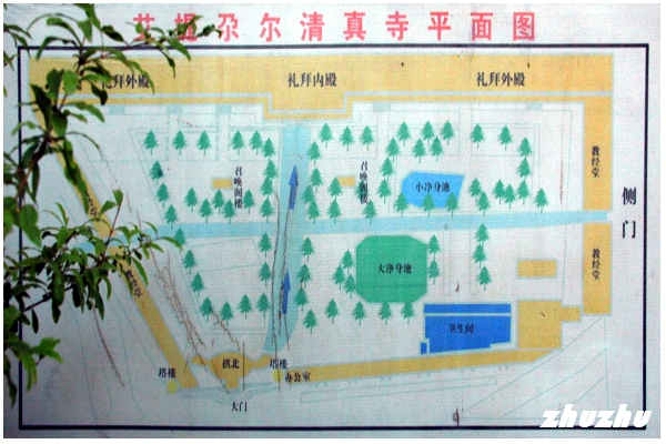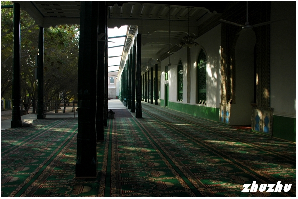 進了大門就是巨大的圓頂拱拜孜,拱拜孜下面是多邊形過庭,兩邊有兩條通道通向庭院,兩條通道之間夾著一個雕花窗戶。拱拜孜高16公尺,直徑10公尺。寺門內有一個20畝的大庭園;南北兩側各有一排18間的經堂,為伊瑪目講經和宗教學生習經之所。從過庭北側的通道走出,是一條寬4.38公尺,長近80公尺的小路,水磨石路面;路兩側種有樹木,路的北側有一大一小兩個水池。