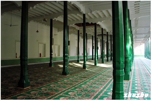 正殿南牆和北牆各有兩扇門和一扇窗戶,正殿內有18根支柱;正殿南北兩側是外殿,北側外殿西牆有壁龕14個,北牆四個。南側外殿西牆有壁龕11個,南牆有四個。在7和8的中間,有一扇雙開門是清真寺後門,門內小院內西牆還有一門,通向外面,後門一般是用來運送屍體的,而且只在週五居瑪日時才使用。北側外殿有彩色藻井五個,長3.6公尺,寬3.2公尺,南側有四個。正殿前廊藻井長6.6公尺,寬5.5公尺。外殿有立柱122根,柱底、柱身刻畫;柱底尺寸基本上是35至40公分。正殿前廊柱高5.4公尺左右,兩側柱高基本是5.1公尺左右。