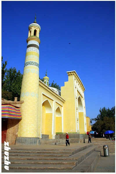 站在艾提尕爾廣場,眼前那直插蒼穹的高塔,就是艾提尕爾大清真寺。艾提尕爾是節日、歡樂的廣場的意思;清真寺是穆斯林舉行宗教活動,做禮拜的叩拜之處。這個位於廣場西邊的清真寺,始建於1442年,是全疆乃至全中國最大的伊斯蘭教禮拜寺,占地達25.22畝,是一個有著濃郁民族風格和宗教色彩的伊斯蘭教古建築群;坐西朝東,由寺門塔樓、庭園、經堂和禮拜殿四大部分組成。