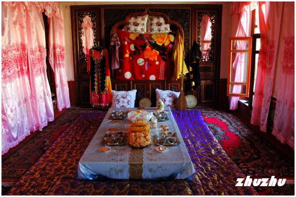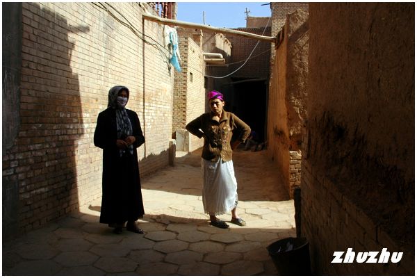 巷道兩邊的維吾爾民居,屋舍很有特點。一般人家都在有限的平面上,蓋起兩到三層土木結構的小樓;也有的向下延伸,建成地下室。客廳、居室皆由木質扶梯、樓梯連結;虛掩的門裏,院內精緻的掛毯,小院中懸掛著嬰兒的小搖籃。家家都有晾臺,位於平面屋頂。每戶也都有不大大但卻精緻的庭院,用於養花或置放花盆;盆景、鮮花與建築物廊柱、木雕、挑簷上的各色花飾交相輝映,錯落有致,幽靜清新。從巷道走過,似乎每個窗戶中都有一個《一千零一夜》的故事。