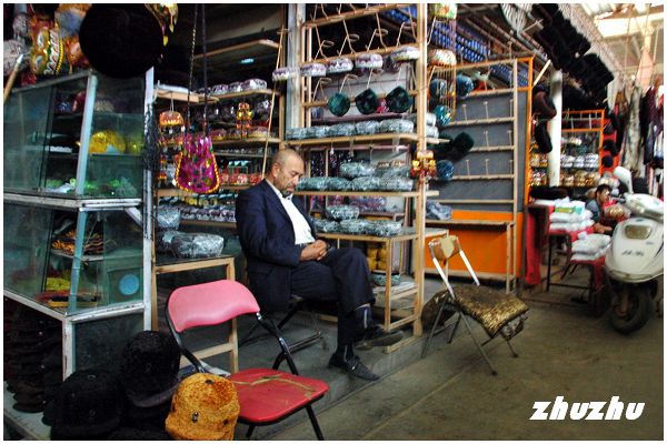 在巴札裡並不是什麼都要買,掛著我的單眼相機,很悠閒自在地晃悠著,這裏看看,那裏摸摸,和那些維族人交談著,看到令我心動的場景和人物就拍照。維族的小花帽至今仍然保留著手工製作的工藝,花樣品種很多。維族男人的花帽非常講究手工、花紋的美觀和實用性;花紋一般簡潔樸素,線條流暢,或黑或白,或藍或墨綠,鮮見色澤豔麗的,但手工卻一點不含糊,除一針一線繡制帽子外層圖案,襯裏則按照大小頭型模具精心定型,一頂帽子需維族婦女製作三至五天時間。