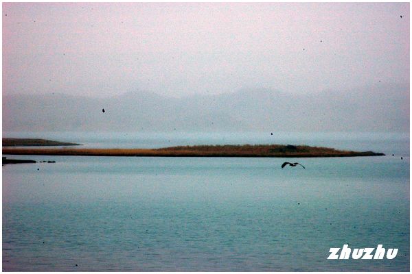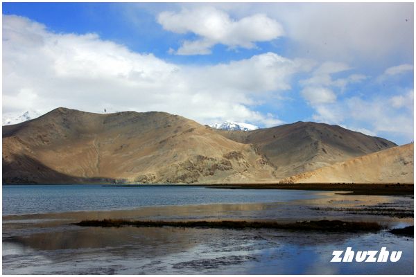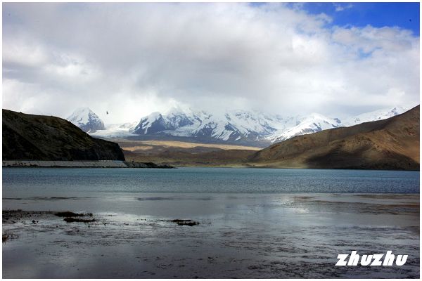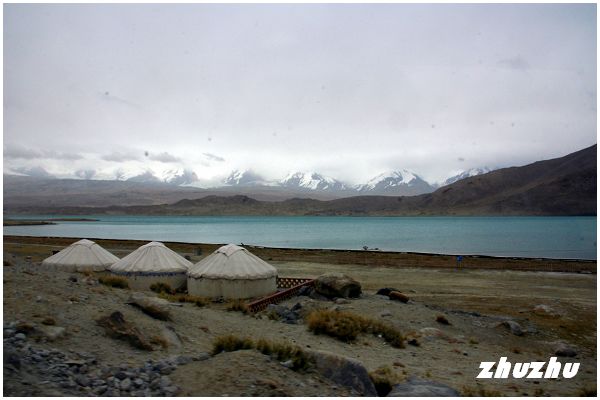 拐過布倫口,過了流沙河,車子向南繼續行駛約一個小時,繞過一座山;突然的,前方現出一片寬廣浩渺的水域,仿佛是煙雨迷濛中隨意揮灑的潑墨。而湖的對面,矇矓中竟然聳立起一座巨鯨般橫亙於天地之間的雪山;心中一喜,終於來到海拔3600公尺,號稱帕米爾高原上最高的湖泊-喀喇庫勒湖了。