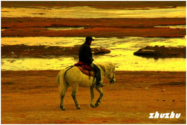 湖畔草地,犛牛、駱駝靜立雪中,無懼風雪。耗牛以其等黝黑長毛、駱駝以健碩體態巍然無動於衷,還舔出厚實的長舌,安靜滿足地捲著秋草……;湖邊廣袤的草地上,柯爾克孜族人的白色氈包,如星辰點亮在已經秋黃的草甸之上,分外醒目;還有雪中策馬的牧人……,完全是一幅平和悠閒的畫面……..。