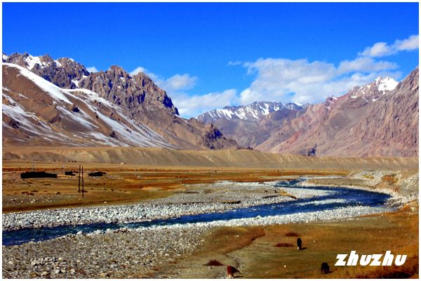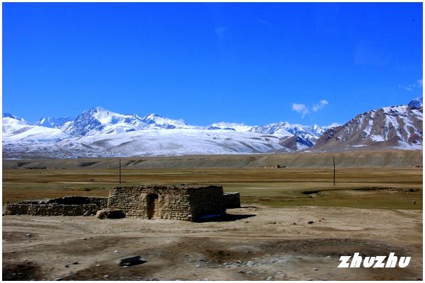 汽車再上了一些坡度,拐進一個山彎,便處在四周都是雪山的包圍之中。這上游的小河段叫塔格敦巴什河,發源於紅其拉甫草原。紅其拉甫,塔吉克語意為有小房子的山溝,果然有兩幢小房子座落在山根陽坡上,註釋著地名。
