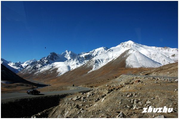 塔什庫爾干河沿途不斷有溪流匯入,主河道因溯上游越來越細小,這會兒已是一道可以躍步跨過的小溪。隨著海拔升高,越野車已在雪線以上;沿途雪嶺綿延,冰峰聳立,溝壑縱橫,山川起伏。塔什庫爾干地勢高峻,平均海拔高度4000公尺以上,氣候乾旱寒冷,長冬無夏。這裏空氣稀薄,為了拍攝相片下車多跑了幾步,再回來時已是氣喘如牛。沿路上,雪山不斷連綿不絕,風景各有特色。