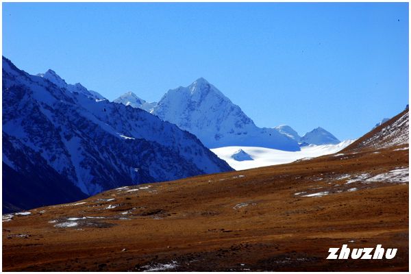 隨著海拔升高,越野車已在雪線以上;沿途雪嶺綿延,冰峰聳立,溝壑縱橫,山川起伏