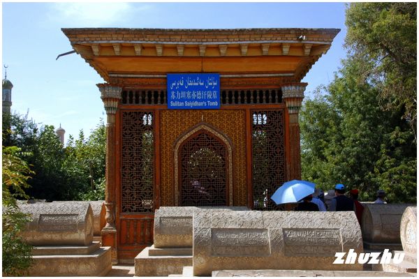 在墓地北部的大片墳區,就是埋葬汗王和他們的宗教信徒的墓地。由磚牆和木柵欄圍起來,築有琉璃磚裝飾的大門,大門內是全用磚砌成的一排排墳墓,牆和墳墓外面,是用各種紋樣圖案的石膏花和有各種鉻文的花磚裝飾。前方插著各種彩旗,居室另修建,整個麻紮有濃郁的伊斯蘭宗教色彩。