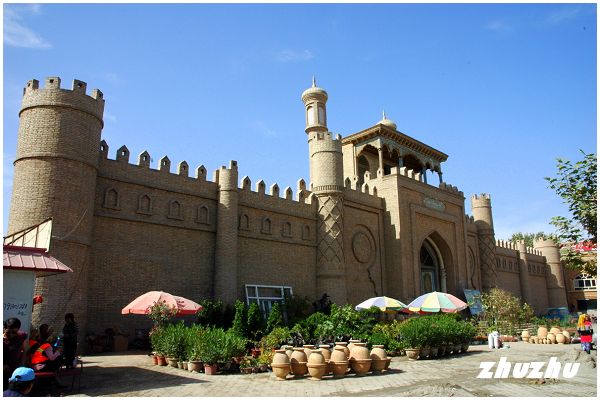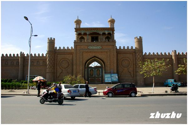 王陵和清真寺馬路對面的是正在修建的葉爾羌汗國王宮。1513年,葉爾羌汗國定都葉爾羌,就是今天的莎車老城;當時絲綢之路馳命走驛,不絕于時月;商胡販客,日款於塞下,商賈雲集,貨若雲屯,人如蜂聚,一派繁榮興旺。莎車也就成為新疆乃至中亞一帶的政治、經濟、文化中心,是有名的商業都會。雖說葉爾羌汗國只有一百多年的光景,但王宮的伊斯蘭式的宮門和宮牆仍頗有氣派,猶有遺風可觀,但內部已經荒蕪像個大雜院了,令人感慨萬分。