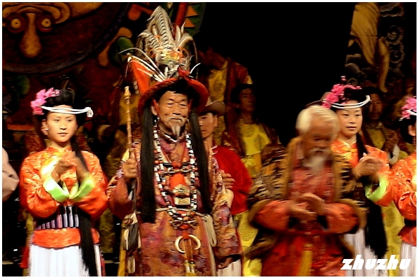首曲演奏完後,主持人出場用納西語唸出掛在舞台上方一橫幅東巴文,意思是歡迎遠道而來的客人之類。接著一位老東巴表演宗教祈福舞蹈,就像帶來了遠古的曠野迴響;他的嗓音和動作,與大研古城、玉龍雪山融為一體,是納西族宗教生活的一個重要部分。納西族東巴教是納西族原始宗教向人為宗教過渡的一種宗教;多達30多種的東巴教儀式是納西東巴文化的主要載體,即用象形文字記載在東巴經書裏的內容,通過各種宗教儀式表現出來,並以宗教儀式傳承下來。