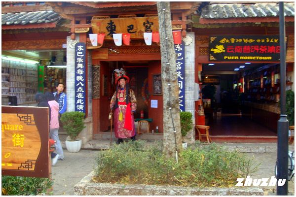 納西族普遍信奉東巴教,東巴是納西語,意為智者,(也有一些地區稱為達巴)也就是巫師和祭司;東巴宮,顧名思義就是智者雲集的地方了。東巴宮坐落在麗江古城東大街,它的門樓上裝飾的是東巴的五幅冠,大門兩旁懸掛著東巴的木牌畫,一位老東巴坐在門口。老東巴很有名,演過無數大片,估計來過麗江的人都見過他;每天他都坐在東巴宮的門口,穿著一身戎裝,可以合影,不過需要小費。