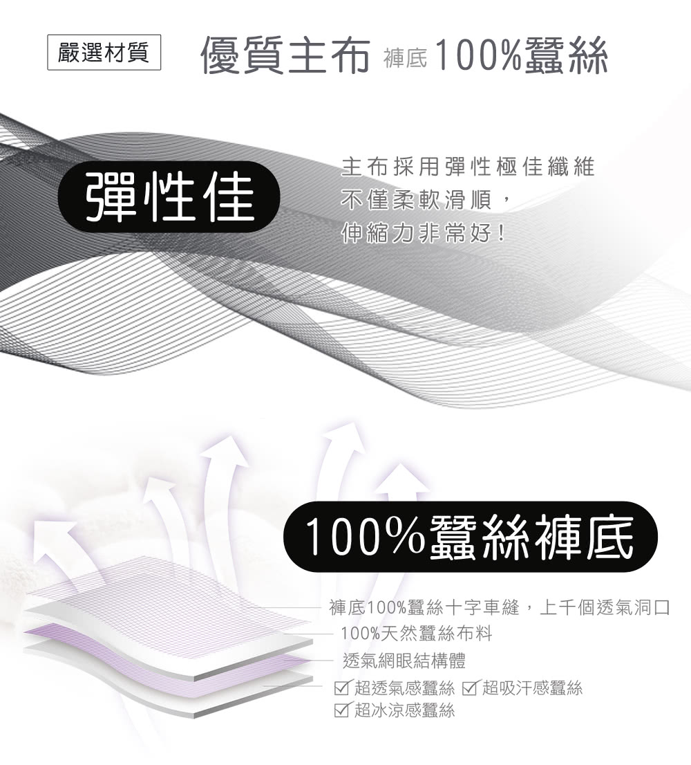 ◆材質:褲底100%蠶絲、主布100%聚酯纖維