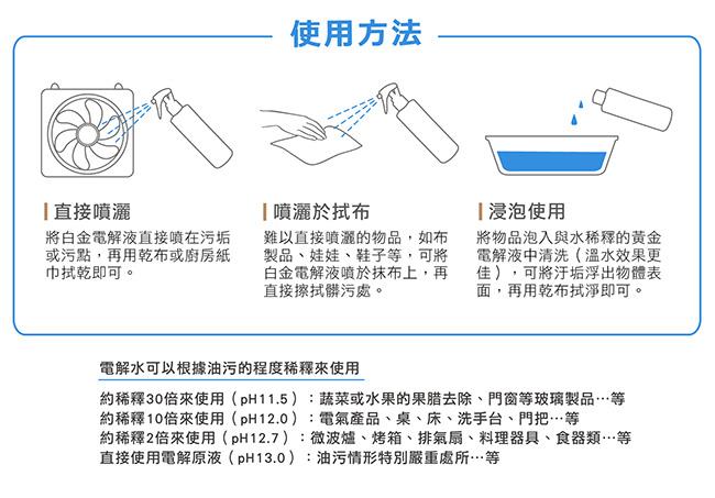使用方法:將本產品適量噴灑在物體表面,即可達到滅菌、消臭、除垢效果。