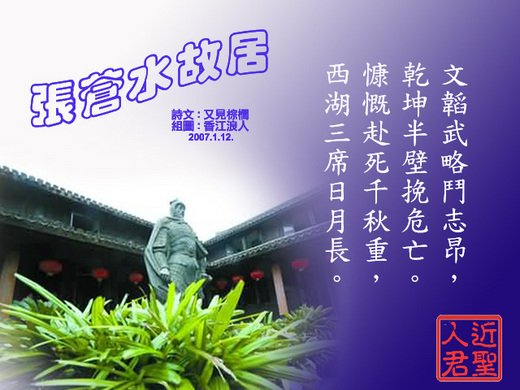 苍水名煌言,字玄箸,鄞县人,是刑部郎张圭章的儿子。早岁能诗,善弓矢,二十一岁那一年,因为赌钱输了,私卖家产偿债,圭章大怒,后来由全木干卖去自己的田,替他还清赌债,并劝他读书。二十三岁举乡试。后两年,李自成陷北京,崇祯殉国,清师接着南下。钱肃乐在宁波起兵,他首先响应,拥鲁王监国,赐进士,加翰林院编修。这以后,他的抵抗异族的斗争就开始了。