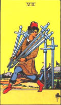 牌面上有個人正孤軍奮戰、躡手躡腳的盜取寶劍,削減敵人軍力,寶劍七意味事情要成功需要策略計謀,多嘗試、懷抱希望、付出努力,終有成功的時候。