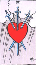 寶劍三的涵義是:一顆柔軟感性的心,被理性所傷,接受這份悲傷,不要逃避,因為悲傷讓人成長,但不要耽溺悲傷的情緒,鑽牛角尖會讓身心不健康哦。