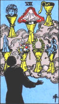 有七個杯子浮在半空中,各自裝載象徵外在形象、冒險、榮耀、財富、