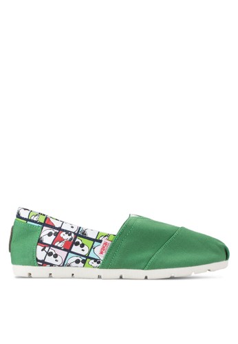 Wakai 的JC 史努比印花撞色懶人鞋,帆布材質配以史努比格紋印花及撞色拼接設計,是休閒百搭的不二選擇。