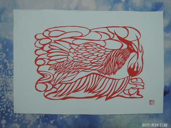 原本的白雲並未形成火焰鳳羽的形狀,是我在構圖時多加的。紅紋白底的搭配凸顯剪紙的傳統本色。