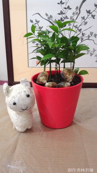 吾乃種花蚌斜理事長……開個小玩笑。盆子裡的蛤蠣殼是作效果用的。這是小駝的最愛,竹柏,象徵平安福氣。看起來就有一種讓人安穩安定的力量。這是可以在室內擺設的植物喔。