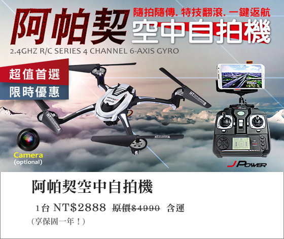 商品訊息簡述: 只要2888元(含運)即可購得原價4990元阿帕契空中自拍機1台,購買即享保固一年!