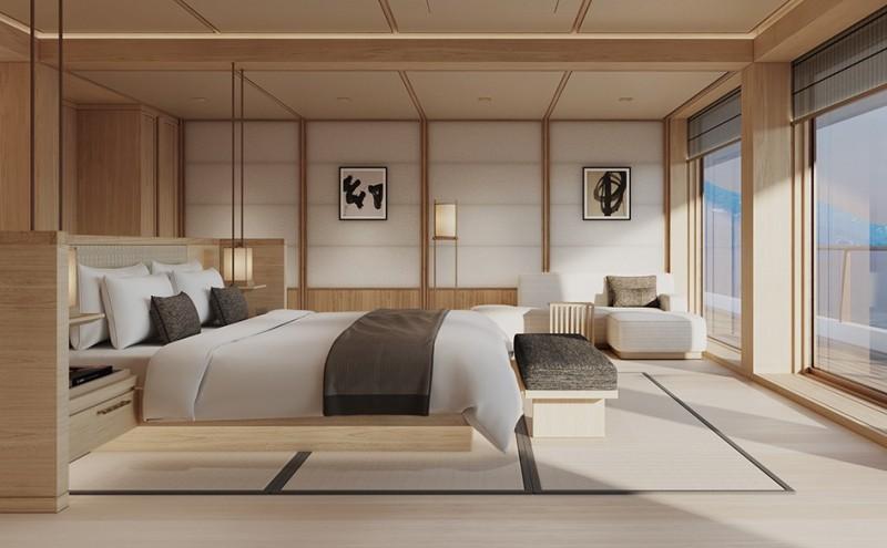 全船僅 47 間套房,以靜謐沉浸式空間為設計概念,極低密度營造無與倫比的私密性,皆擁2.3 公尺挑高、落地窗、寬闊私人露台,落地窗和寬敞的露台直通大海,挑高的天花板營造出開闊通透之感,室內與海面相融,彷彿懸浮於海天之間,旅人可在晨光或月色下靜靜聆聽潮聲。室內裝潢採用白蠟木地板、石灰華浴缸和亞麻牆面,並融合了先進的科技,打造出一個直觀、高雅的專屬空間。套房內配置水療式衛浴、隱藏式科技設備、以及專屬私人管家Host,提供完全不受打擾的安縵式寧靜。
