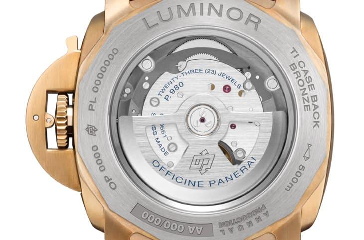 PAM01678搭載P.980自動機芯,直徑12½法分、厚度4.2mm,這種緊湊的尺寸是實現錶殼薄型化的關鍵因素,它擁有單發條盒提供72小時動力儲存,符合現代人戴錶的基本需求。透過透明底蓋,佩戴者可以欣賞到機芯的機械結構與打磨工藝,雖然主要強調實用性,但其鏤空自動盤與夾板的倒角修飾仍展現高級製錶的細節,機芯採橫跨式擺輪橋板設計,相較於傳統單臂式設計的抗震能力更強,震頻每小時28,800次,並也有停秒功能,便於精準校時。P.980機芯出廠前經過嚴格的六方位測試,確保精準可靠,結合青銅錶殼與復古面盤,形成一只兼具耐用、精準、有型獨特的現代運動工具錶,完美詮釋沛納海「工具與奢華兼具」的品牌精神。