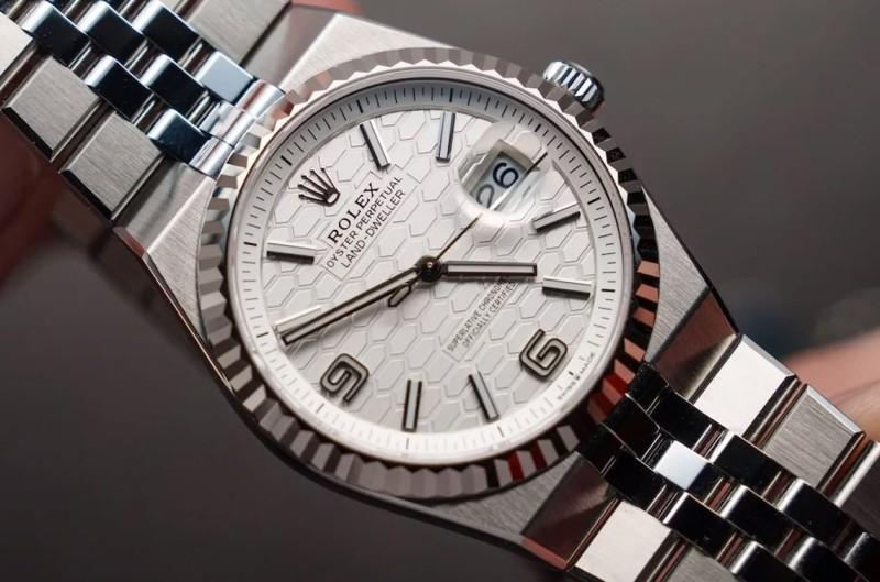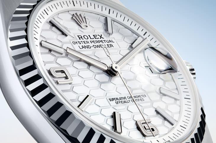 面盤表面利用飛秒雷射技術刻出規則的蜂巢格紋,每一個六角形單元都帶有細緻的磨砂質感,而邊界則是精密蝕刻的線條,這種處理讓整個面盤在不同光線下呈現出非常豐富的立體感,既有科技感,也帶著幾何美學的味道。錶圈方面,這款錶仍然採用勞力士招牌的三角坑紋,但細節其實經過重新調整,坑紋的寬度略為增加,整體槽數約60個,比傳統款式更少,因此看起來更俐落、更現代,搭配白金材質,在光線下依然保有那種熟悉的閃耀感。時標與指針則融合了探險風格元素,6點與9點位置採用鏤空立體數字,造型讓人聯想到Explorer的經典設計,指針線條則變得更筆直、俐落,整體視覺更加運動化,這種把幾何面盤、運動時標與傳統坑紋瞟圈結合的做法,使Land-Dweller在勞力士眾多錶款中顯得格外獨特。