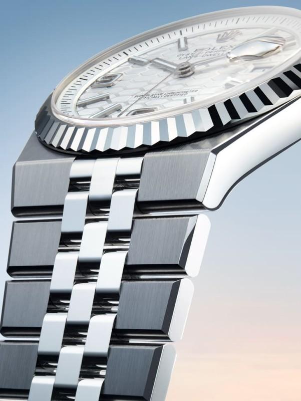 Land-Dweller採用的是一體式錶殼與鍊帶結構,這在近年高級運動錶市場相當熱門,但勞力士過去很少用這種形式,因此顯得格外新鮮,Land-Dweller的錶殼輪廓帶有一點酒桶形的味道,線條比傳統Datejust更銳利、也更現代,與之相連的,是品牌特別為此系列開發的Flat Jubilee錶帶,乍看之下它延續了經典紀念型五鍊節結構,但細節其實完全不同,前者的中央鍊節略微隆起並經過拋光處理,兩側鍊節則採霧面磨砂,形成明顯的光影層次。尺寸方面,36mm版本其實是整個系列中比例最協調的一款,它那43.5mm的錶耳到錶耳長度讓鍊帶能自然貼合手腕,加上不到10mm的厚度,佩戴起來既有運動錶的存在感,又不會顯得笨重,搭配隱蔽式皇冠錶扣,整只錶在視覺上呈現出一種非常流暢的一體感。