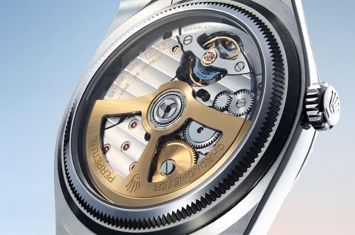 這款錶內部配置的是7135機心,是勞力士近年最重要的一次技術突破,怎麼說呢?首先是震頻,7135機芯達到每小時36,000次擺動,也就是5Hz,屬於高震頻機芯的等級,這種頻率能讓時間顯示更穩定,也提高抗震與走時精度,更關鍵的是,它擁有全新的Dynapulse動態脈衝擒縱系統,這套擒縱結構改以旋轉方式傳遞能量,而不是傳統的滑動接觸,因此摩擦更低、效率更高。機芯內部還整合了多項技術,例如矽材質Syloxi游絲、陶瓷擺輪軸,以及改良版Paraflex避震裝置,這些設計的目的是在維持高震頻的同時,仍然保持良好的耐用度與穩定性。另一個罕見之處,是Land-Dweller採用了透明底蓋,對於長期習慣實底蓋的勞力士來說,這其實是一個不小的改變,透過藍寶石水晶,可以看到金質鏤空自動盤與日內瓦波紋裝飾的機芯結構,當然,它同樣通過COSC與勞力士頂級天文台認證,日誤差控制在±2秒內,精準度依舊維持品牌一貫的高標準。