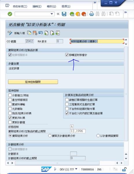 此時,需進入Tcode: OKG9 將"移轉至財務會計" 先取消掉.