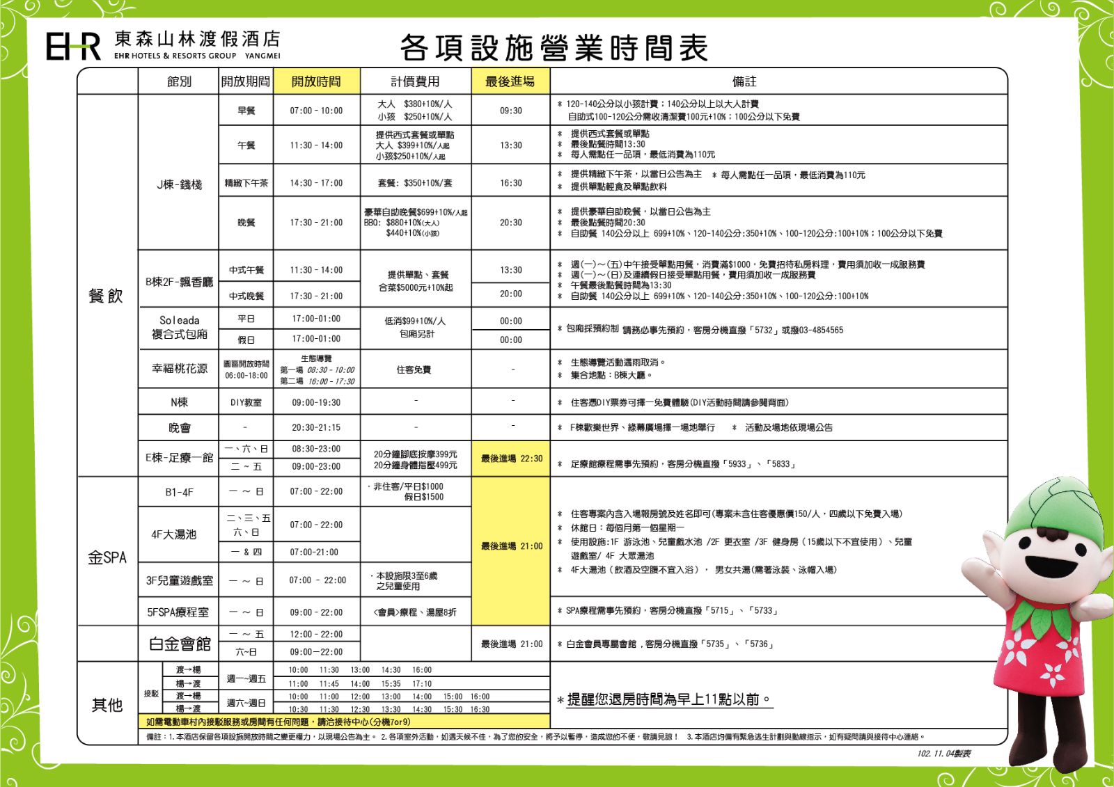 ※各項設施營業時間表、【東森山林渡假酒店】園區導覽圖