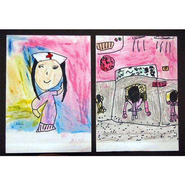 但曾經有一位孩子的作品讓我印象深刻。他畫的是一位背對畫面的護理師,坐在辦公隔間內打電腦,牆上還有個時鐘。原來,這位孩子的媽媽就是護理師,偶爾媽媽會帶他到工作場所,並用心觀察了當下的情境。那幅畫,或許不是大家心中典型的「護理師形象」,卻深刻而真實,充滿記憶與情感。