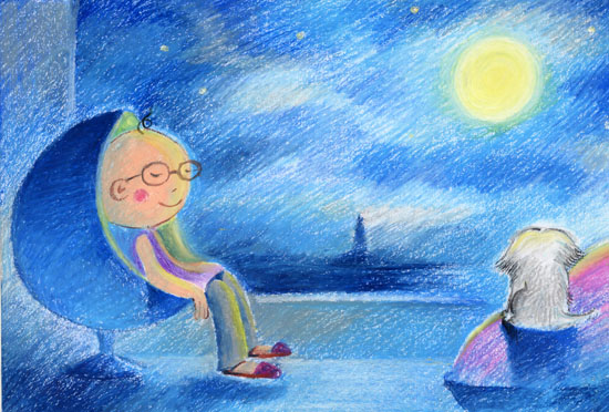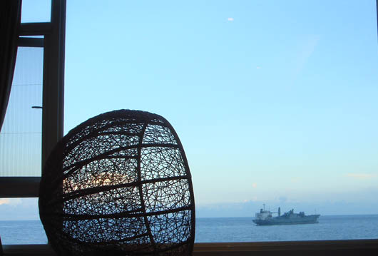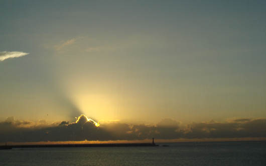 早上呢,就是起個一大早,躺在被窩中,看日出的海面