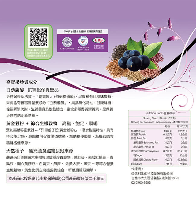 4.內容物名稱(成分):酵素菁華、洋車前子穀、紅葡萄、硬紅麥、去殼紅扁豆、青扁豆、開心黃豌豆、白扁豆、燕麥、金黃大麥、法國青扁豆、黑豆、卡姆小麥、深紅扁豆、黑扁豆、黃金扁豆、小米、紫大麥、亞麻仁籽、麥芽糊精、香料、檸檬酸、蔗糖素。