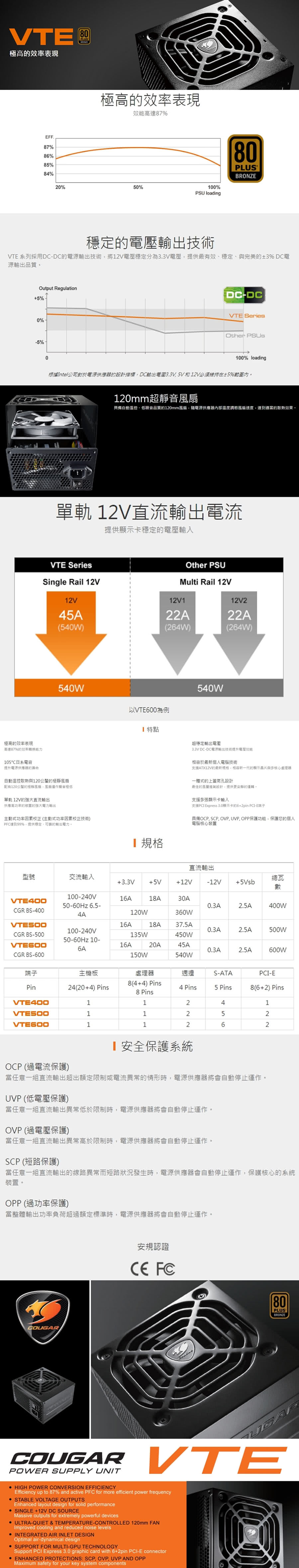 5544732 【COUGAR 美洲獅】VTE 600W 電源供應器(80 PLUS 銅牌) 5544732