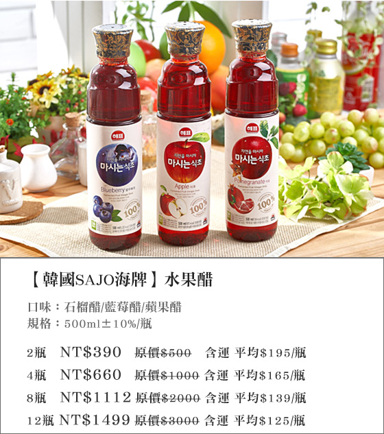 商品訊息簡述: 平均每瓶最低只要125元起(含運)即可享有【韓國SAJO海牌】水果醋2瓶/4瓶/8瓶/12瓶(500ml±10%/瓶),口味:石榴醋/藍莓醋/蘋果醋。